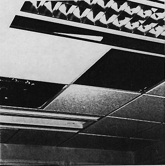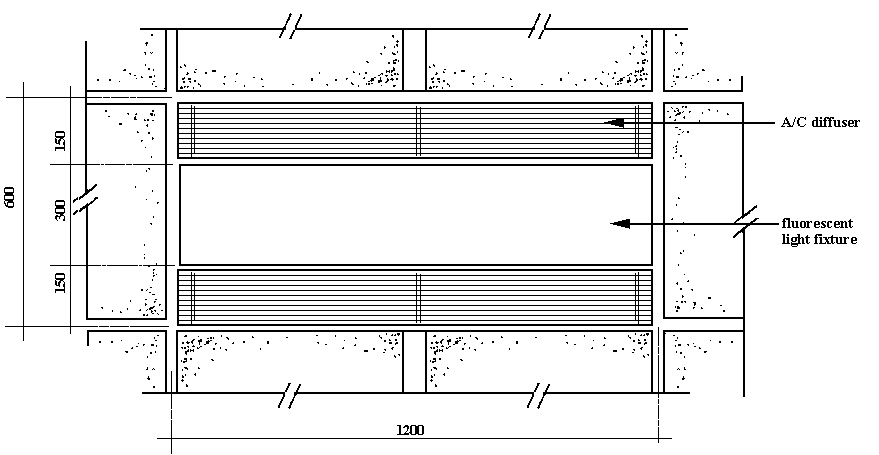 600 X 600 standard tile module is used while the ceiling is composed of sets of 12 modules. Suspended ceilings are adaptable to most types of structural systems. They allow maximum freedom of positioning of the structural elements and permit virtually any type of mechanical equipment to be installed above them. There is also no restriction on the direction in which ducts and services may run.